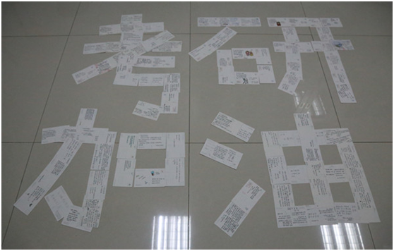 这是员工们为即将考研的学长学姐精心准备的祝福礼物。早在半个月前,公司员工党支部党员就开始策划本次行动,提前将明信片分发给老师和员工,由他们写上对考研学子的寄语,有的员工还加上自己的创意涂鸦。最后,大家将这些明信片摆成“考研加油”的字样,给考研学子加油打气。