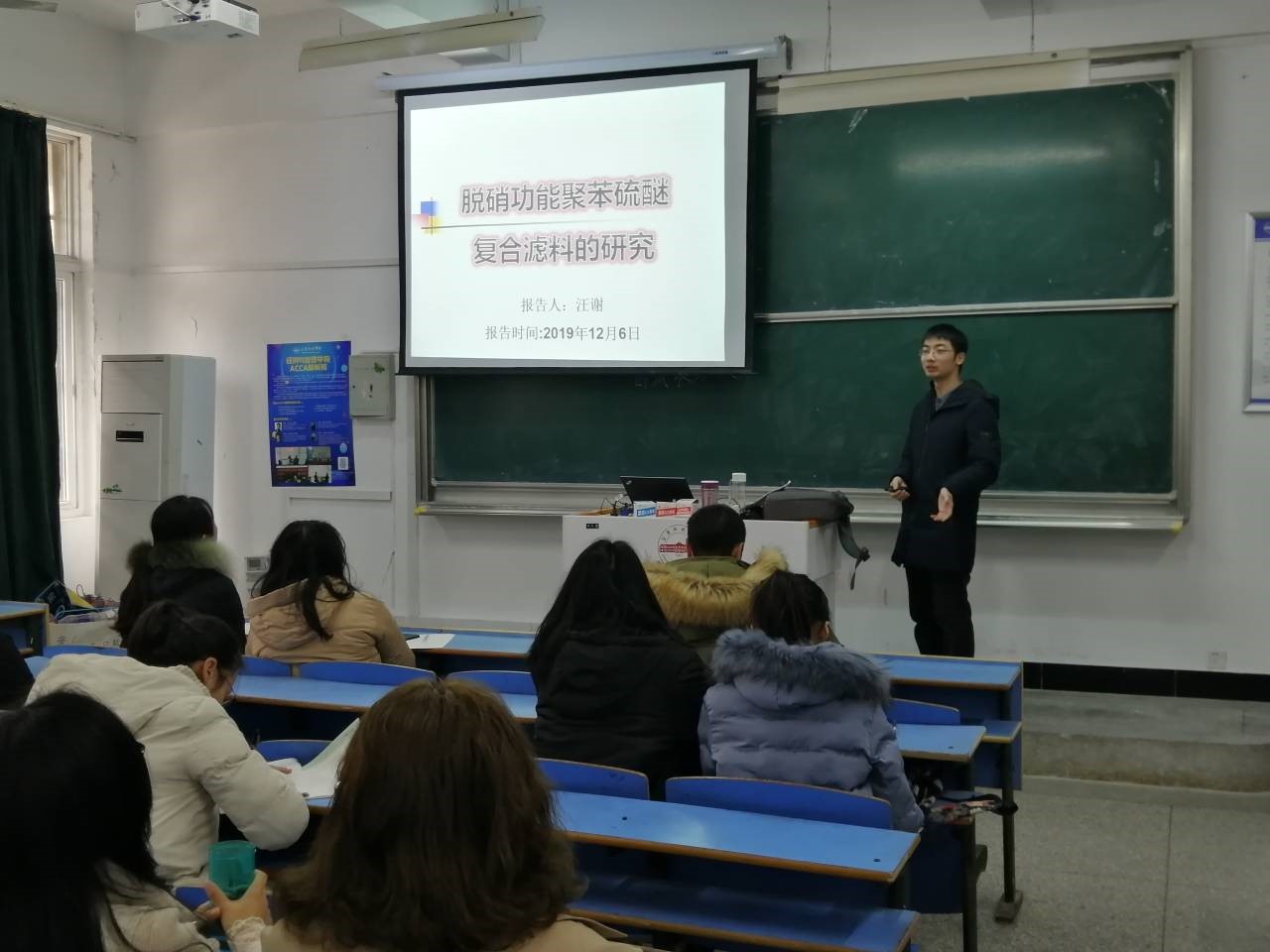 2019年12月6日上午10点,bevictor1946韦德官网青年教师汪谢博士在龙山校区教学楼C105教室作了一场题为“脱硝功能聚苯硫醚复合滤料的研究”的学术报告,公司材料化学专业部分教师及16、17级部分本科生参与了这次学术交流活动。