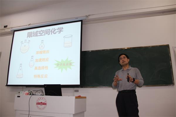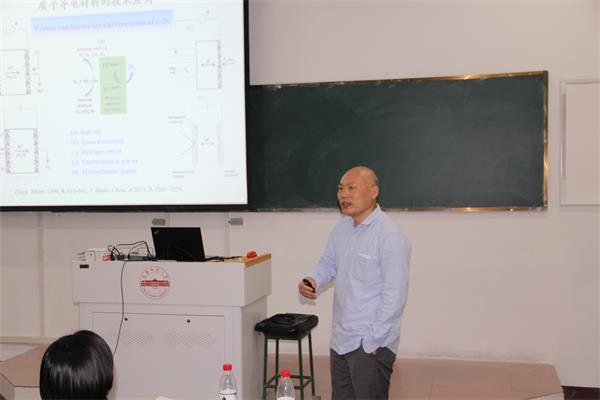 任小明教授作了以“周期性多孔质子导体的结构和导电性质” 为主题的报告。报告中任小明教授简单介绍了质子导体的原理和结构设计,主要围绕开骨架金属硫簇质子导体、开骨架磷酸盐质子导体、Zr-MOFs质子导体进行了系统的报告。任老师报告内容丰富,启发性强,开拓了同学们的学术视野,激发了热爱科学研究的兴趣。
