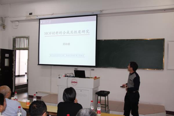 郑和根教授作了以“MOF材料的合成及性质研究”为主题的报告。报告中郑和根教授重点讲述了单一MOF材料的合成及性质研究和复合MOF材料的合成及性质研究。郑教授的报告深入浅出,激发了公司师生对配位化学的浓厚兴趣。