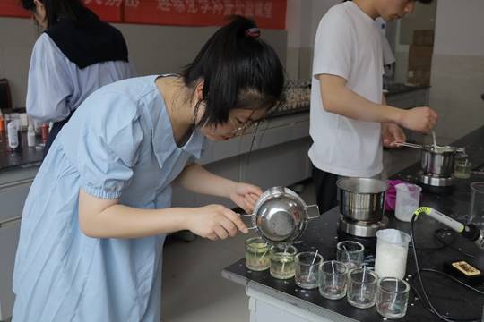 在看完简单的示范后,化学专业2021(2)班的黄宿奇便迫不及待地想要进行尝试。“前面进行的都很顺利,但在我尝试融化大豆蜡的过程中,蜡液燃烧的烟味较大。”在工作人员细心地指导下,他不仅成功做出了自己专属的香薰蜡烛,还发现了减少烟味的“秘诀”——保持匀速地搅拌蜡液。“在这次动手操作中我感受到了化学的奇妙之处,以后我还会继续学习理论知识,在提高实践能力的同时探索化学的奥秘。”