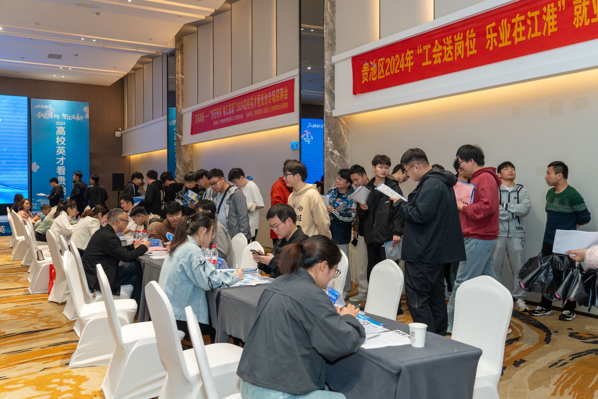 活动中,师生代表参加了由池州高新区、贵池区人力资源和社会保障局联合主办的专场招聘会,来自池州高新区二十家重点企业齐聚一堂,提供了231个优质岗位。毕业生积极与企业代表沟通交流,主动了解岗位需求、发展前景及企业文化等信息。参加招聘会的企业代表认为公司培养的员工专业素养高、实践能力强,非常符合企业对人才的需求。招聘会后参会师生还参加了园区创新创业故事分享交流会,了解了多位成功创业者的创业历程、心得体会和成功经验。
