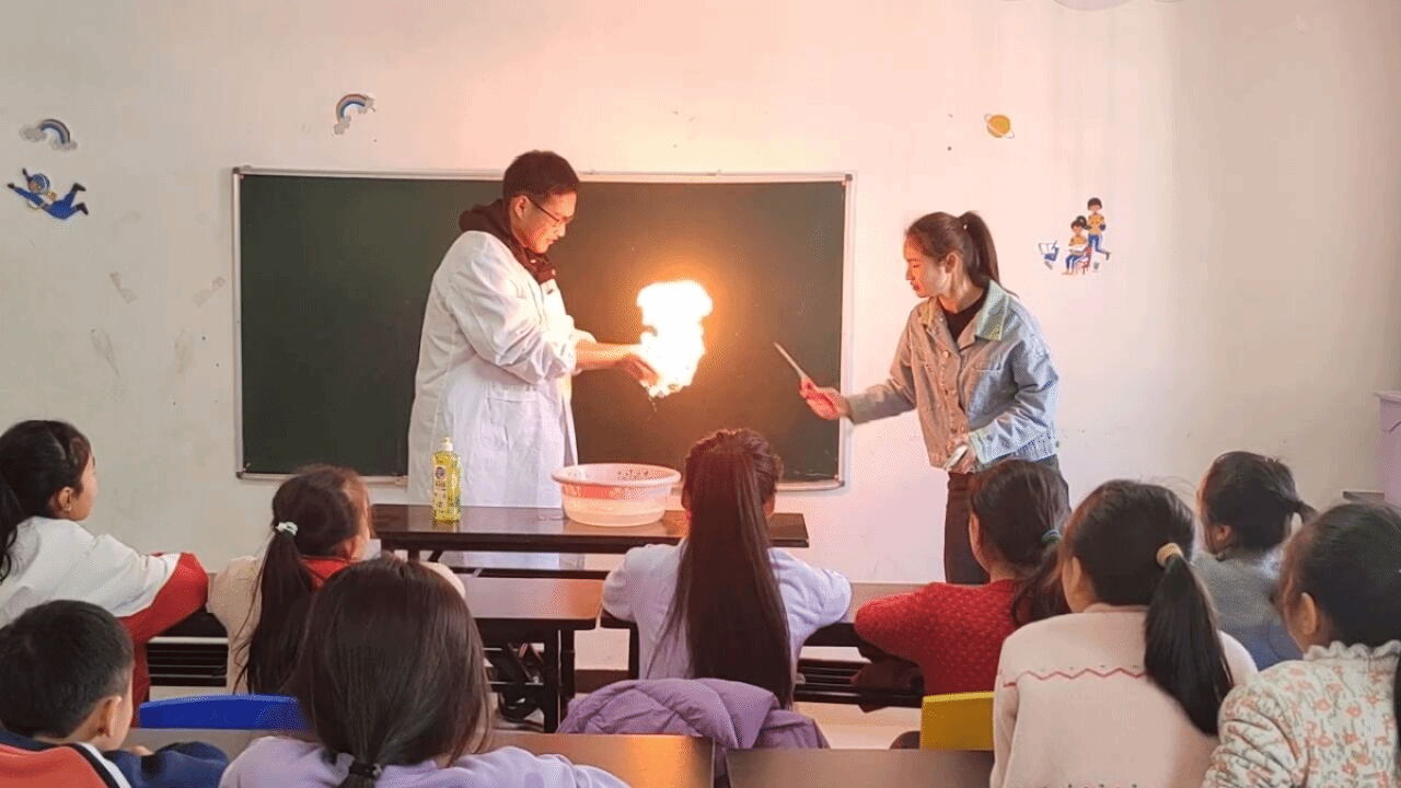 “火竟然能在手掌上点燃”“溶液颜色是怎么发生变化的?”“为什么会产生这么多泡沫?”实验演示过程中,同学们踊跃提问,积极与团队成员进行互动。手心里的高温火焰,形状酷似象牙的巨大气泡,变化多样的溶液颜色……枯燥无味的科学知识转变为眼前生动的科学现象,团队成员结合实践引导孩子们揭秘科学原理,让孩子们更加直观地认识科学、学习科学。