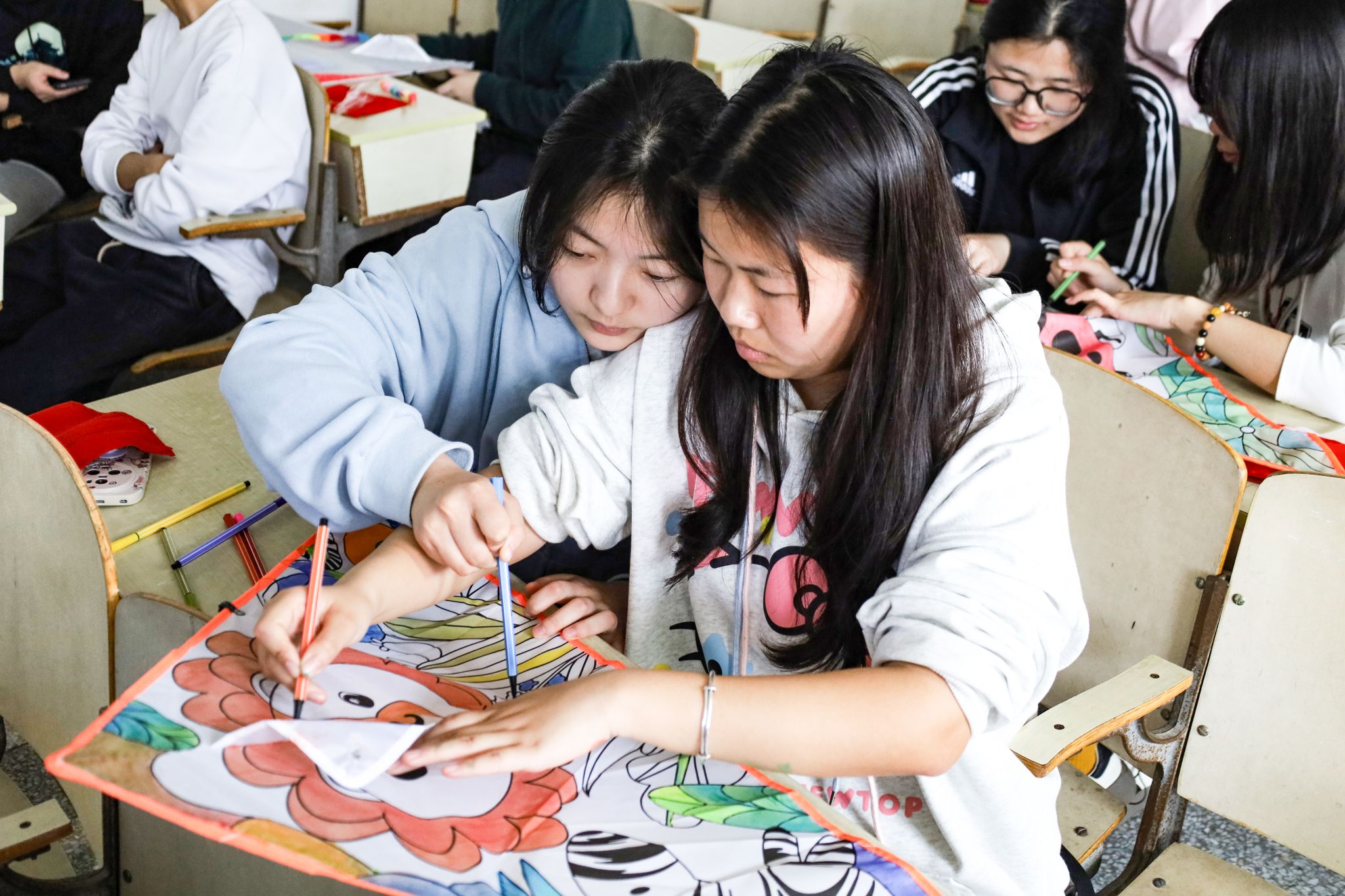 勾勒线稿、分区涂色,员工们经过一小时的绘制,陆续绘出了不同的图案。放松提线、迎风奔跑、腾空飞跃……15只风筝在空中高高飘扬。化学工程与工艺专业2022(1)班的沈怡然拿着她的风筝作品向同学展示。谈及活动感受,她表示,这次活动不仅有利于员工的心理健康发展,还提高了员工的审美能力和动手能力。