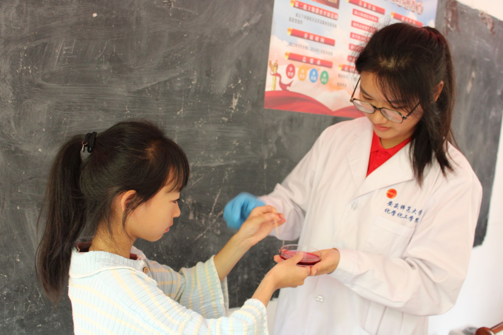 考虑到当地不少低龄段儿童从未接触过化学相关实验,团队成员将七年以来的两万余张实验图片与1000余个视频素材整理在册,制作了一部名为《科普之路》的微型纪录片。“希望通过这种方式,让孩子们爱上化学,感受科普的魅力。”材料化学专业2023(1)班的储健表示。