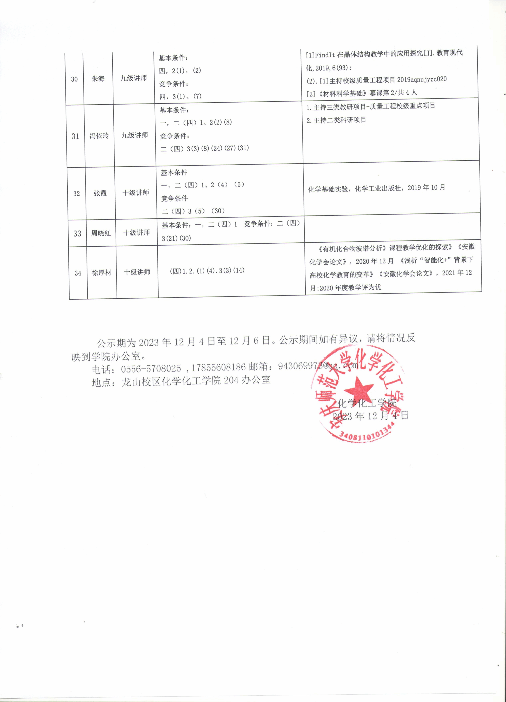 7 | 刘涛 | 四级教授 | 基本条件: 一,二(二)1 竞争条件: 二(二)2(3)(10)、3(31) | 1.安徽省线上教学成果一等奖(4),2022.5,CSSCI 2.一种乙酰基丁香酸-2-氯乙醇酯的合成方法,发明专利,2020,8,14 |