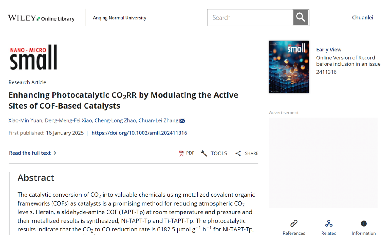 近日,bevictor1946韦德官网张传磊课题组在国际权威期刊《Small》(中科院SCI一区TOP期刊,影响因子13)上发表题为“Enhancing Photocatalytic CO2RR by Modulating the Active Sites of COF-based Catalysts”的研究性论文。该论文第一作者为公司化学专业2022级硕士生原晓敏,指导教师张传磊为唯一通讯作者,bevictor1946韦德官网为唯一通讯单位。