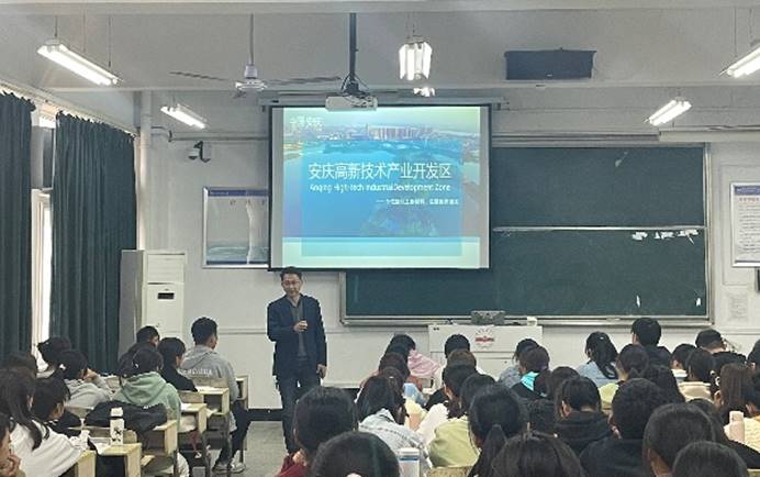 材料化学专业负责人武琳老师从提问引入专业介绍主题。她围绕材料化学专业简介、人才培养方案、专业团队力量以及该专业的就业与深造等四个方面进行阐述,通过创设日常生活情境、列举数字进行比较、讨论材料化学专业知识以及援引专业著名学者的相关介绍,对材料化学专业进行了全方位、多层次、立体化的介绍。化学工程与工艺专业负责人陈静娟老师从化学工程与工艺专业是什么、如何成为化学工程与工艺专业的专业人才、本专业就业与考研情况三个方面介绍了专业情况。化工新材料产业公司(研究院)常务副经理官叶斌老师分别向两个专业同学分析了安庆高新技术产业开发区战略定位、政策支撑以及区位优势,鼓励同学们不断提升专业本领,站上更好的“赛道起跑点”,留在高新区,留在安庆就业创业。