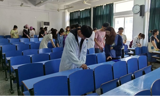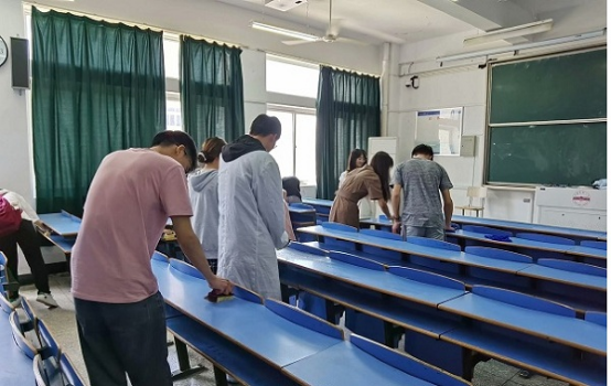装满一壶自制的清洁剂,均匀地喷洒在桌面上,再用刷子清理污垢,最后用抹布轻轻擦拭。化学专业2019(2)班的戴志远完成自己的任务后,挂满汗水的脸颊也露出了微笑。“保持教室的清洁卫生是我们每个人的责任和义务,作为员工党员,我们更应以实际行动呼吁着大家一起行动起来,共建文明和谐的校园。”他说。