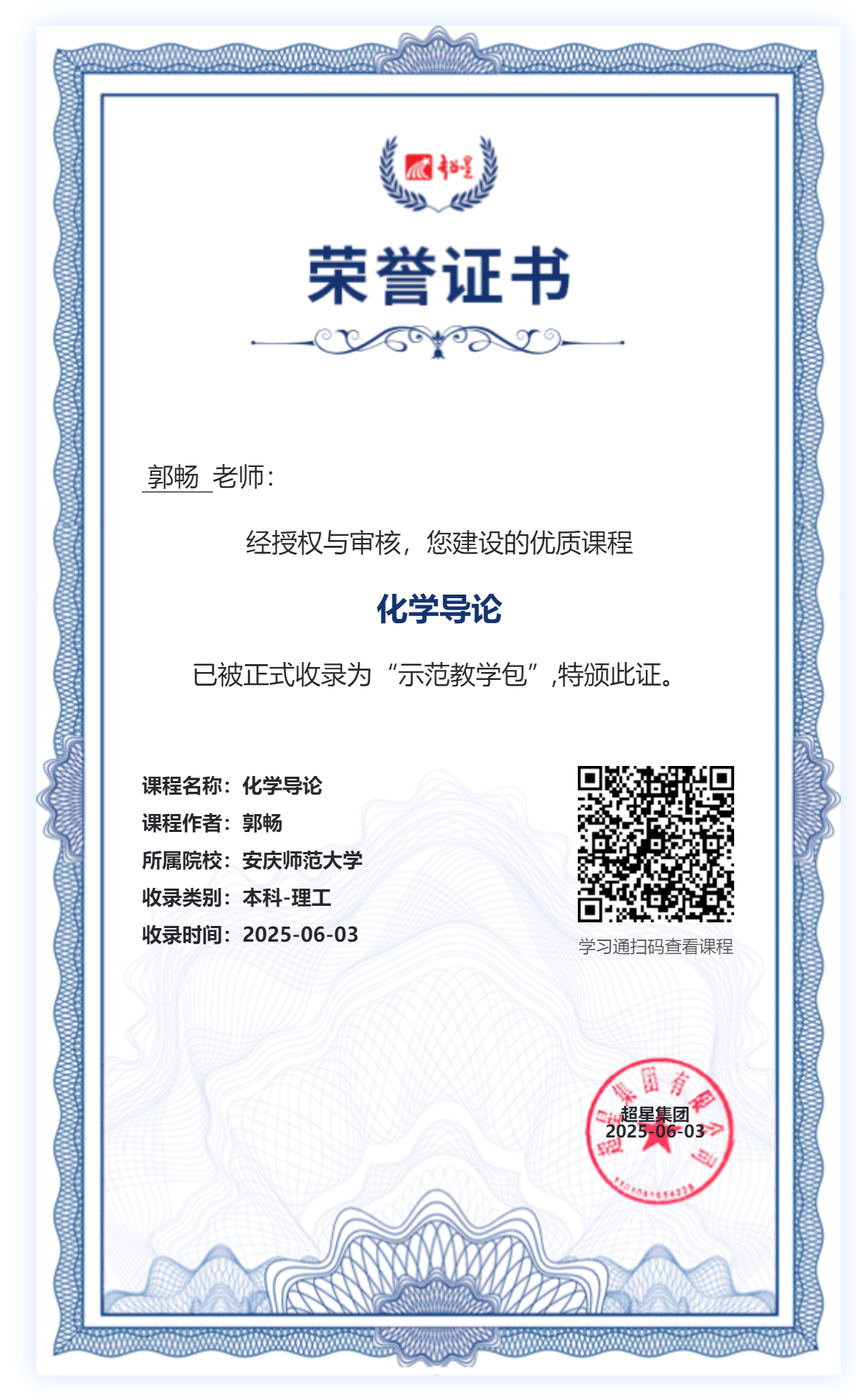 近日,安徽省教科文卫体系统职工创新工作室主持人、bevictor1946韦德官网郭畅教授主持建设的共享课程资源《化学导论》,经超星集团有限公司严格审核与授权,正式收录为本科理工类“示范教学包”。该课程资源是2023年获评的安徽省省级课程思政示范课,是郭畅职工创新工作室的重要建设成果,也是公司基础课程持续改革创新的重要成果,亦是郭畅教授继《物理化学(1)(2)》在线课程后,第二门获评超星“示范教学包”的课程,标志着公司在推动优质课程资源共享与教学模式创新方面取得的又一标志性进展。