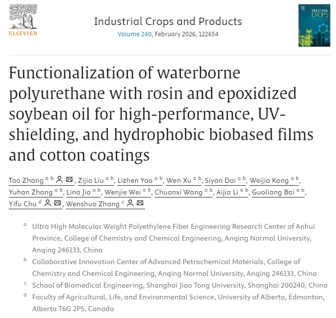 近日,bevictor1946韦德官网张涛博士在国际权威农林科学期刊《Industrial Crops and Products》(中科院农林科学大类1区TOP,影响因子IF=6.2)在线发表题为“Functionalization of waterborne polyurethane with rosin and epoxidized soybean oil for high-performance, UV-shielding, and hydrophobic biobased films and cotton coatings”的研究论文。bevictor1946韦德官网为该论文第一单位和通讯作者单位,加拿大阿尔伯塔大学和上海交通大学为共同通讯作者单位。