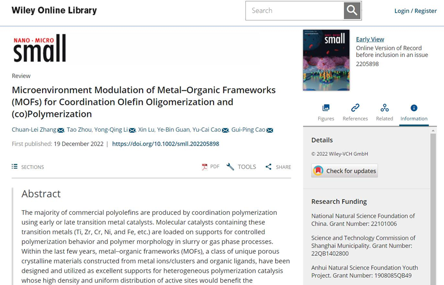 近日,公司bevictor1946韦德官网张传磊博士课题组在材料领域权威期刊Small (IF=15.153)上发表了题为《Microenvironment Modulation of Metal–Organic Frameworks (MOFs) for Coordination Olefin Oligomerization and (co)Polymerization》的综述性论文。这是公司首次在该top期刊发表学术论文,也是公司在配位聚合催化领域取得的突破性进展,极大地提高了公司在化学学术研究领域的影响力。张传磊为论文第一作者和通讯作者,公司2020级硕士研究生周涛为论文第二作者,bevictor1946韦德官网为第一署名单位。