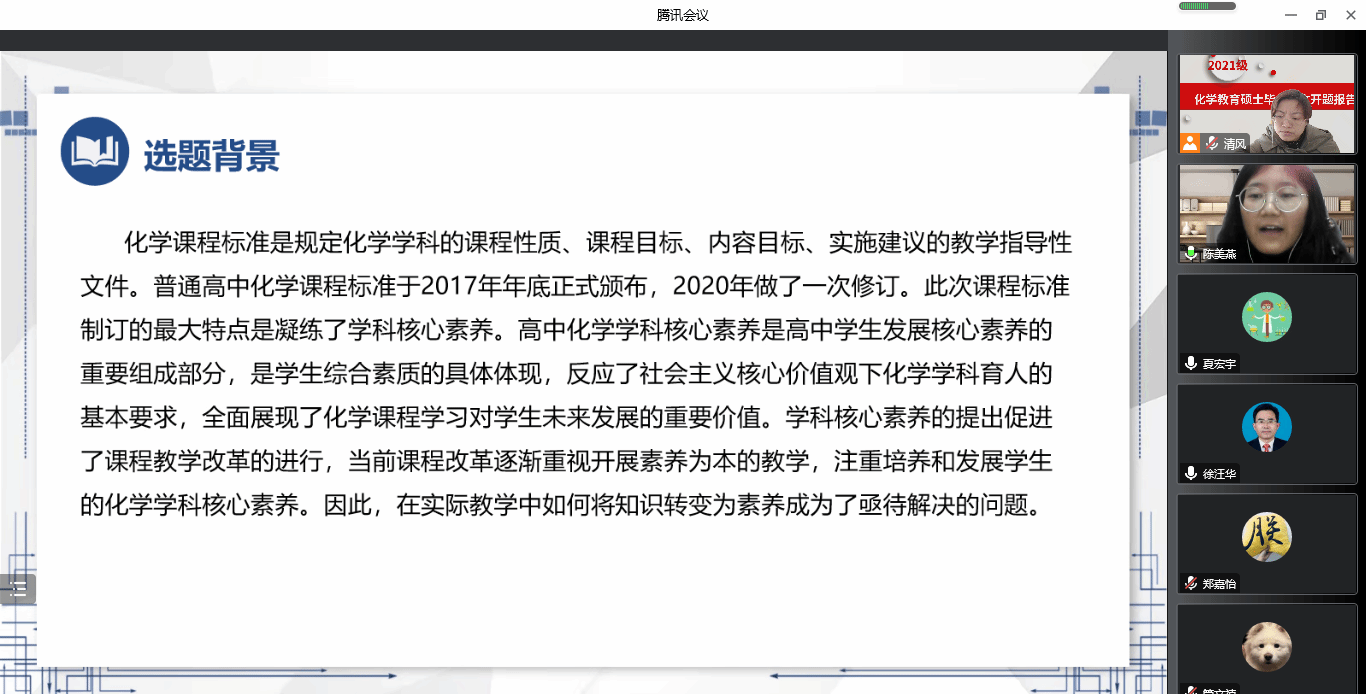 2022年12月19日下午,为落实公司产品方案,加强公司产品过程管理,bevictor1946韦德官网采用腾讯会议的形式在线举行了2021级学科教学(化学)专业硕士研究生学位论文开题报告会。开题报告审核小组由学科教学(化学)专业硕士学位点负责人和硕士生导师组成,报告会由学位点负责人郭畅教授主持。2021级学科教学(化学)全体研究生参与了本次答辩,2022级研究生全程旁听。