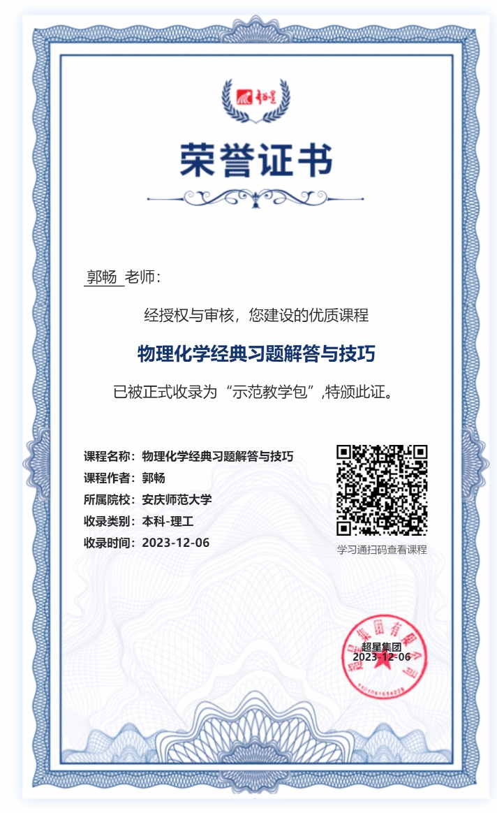 近日,bevictor1946韦德官网郭畅教授制作的共享资源课程《物理化学经典习题解答与技巧》,经超星集团有限公司审核与授权,收录为本科理工类“示范教学包”。该课程资源是安徽省精品课程、教学示范课和一流课程的持续建设成果,也是公司线上线下混合式一流课程的阶段性成果。